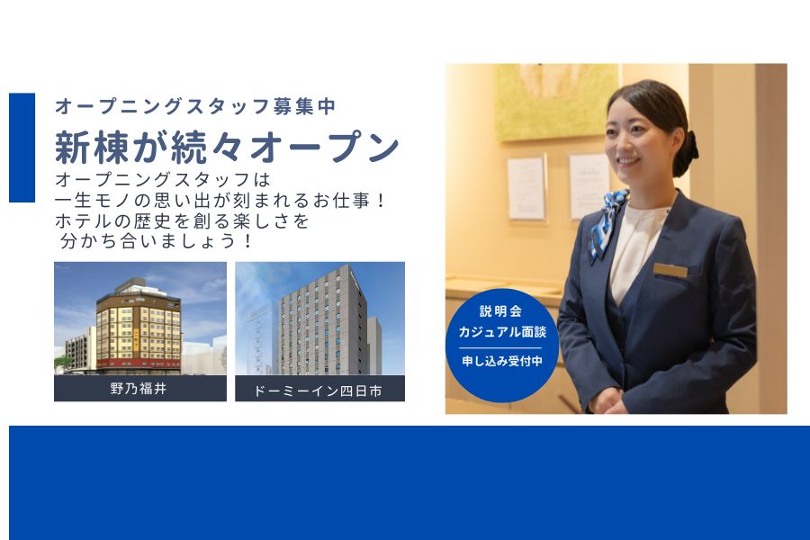 現在、福井・四日市・小松・千歳で、新しい歴史を共に刻む仲間を待っています。ホテル業界に興味がある方はもちろん、「新しいことに挑戦したい」「チームで何かを成し遂げたい」という情熱をお持ちの方、大歓迎です。